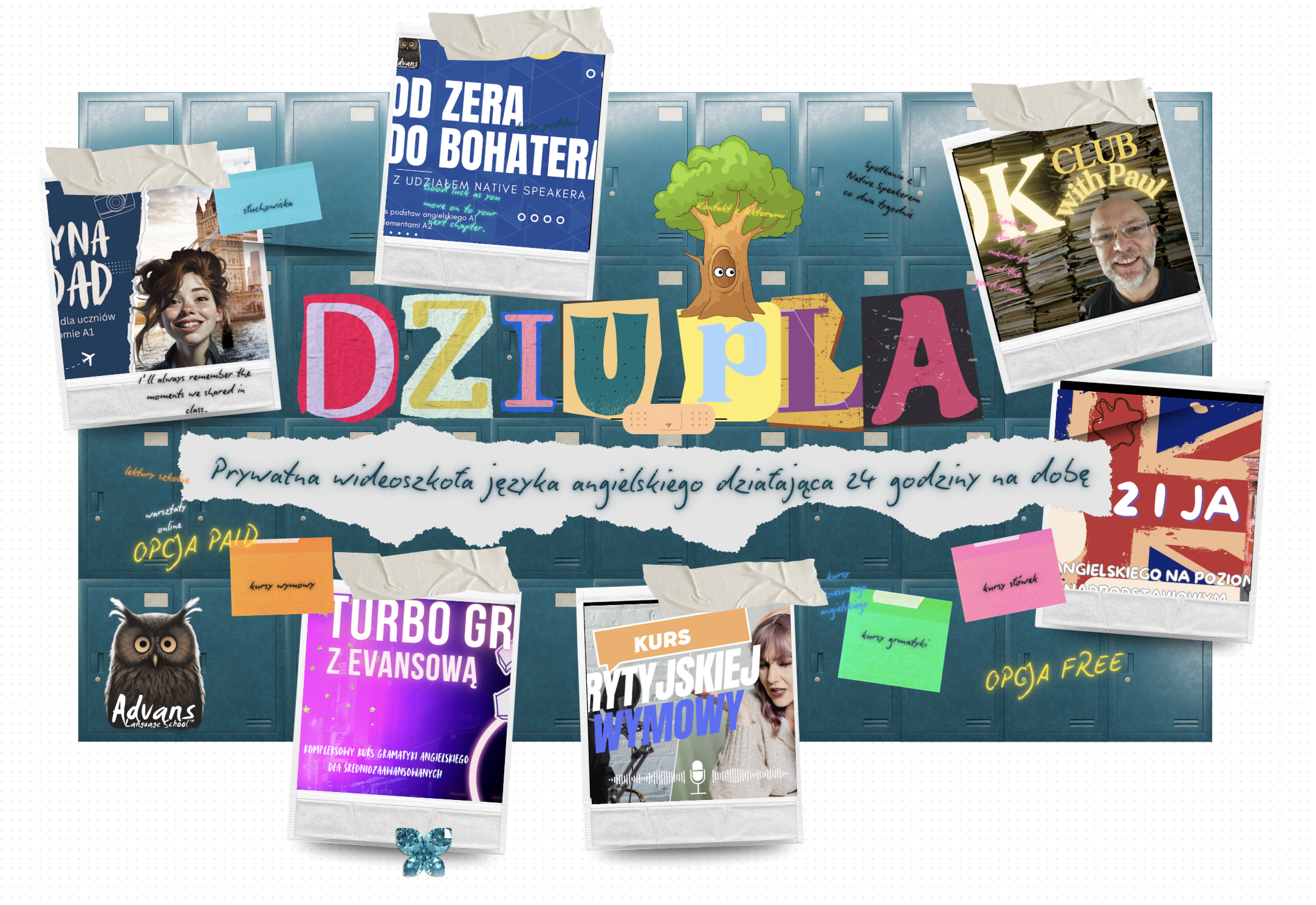 Komfortowa nauka j.angielskiego dla zabieganych i tych, którzy nie są w stanie uczyć się aktywnie. Nauka odbywa się w domu, w wolnej dla Ciebie chwili. Oglądasz lekcje nagrane uprzednio przez lektora i oddajesz zadania domowe (opcjonalne). Dziupla zawiera znakomite materiały dostępne do pobrania po każdej lekcji. Praktyka angielskiego odbywa się na fiszkach, grach i zadaniach domowych ocenianych przez lektora. Lekcja w każdym rozpoczętym przez ciebie kursie udostępniana jest co tydzień. Co dwa tygodnie odbywa się spotkanie z Native Speakerem w ramach Klubu Książki "Book Club".